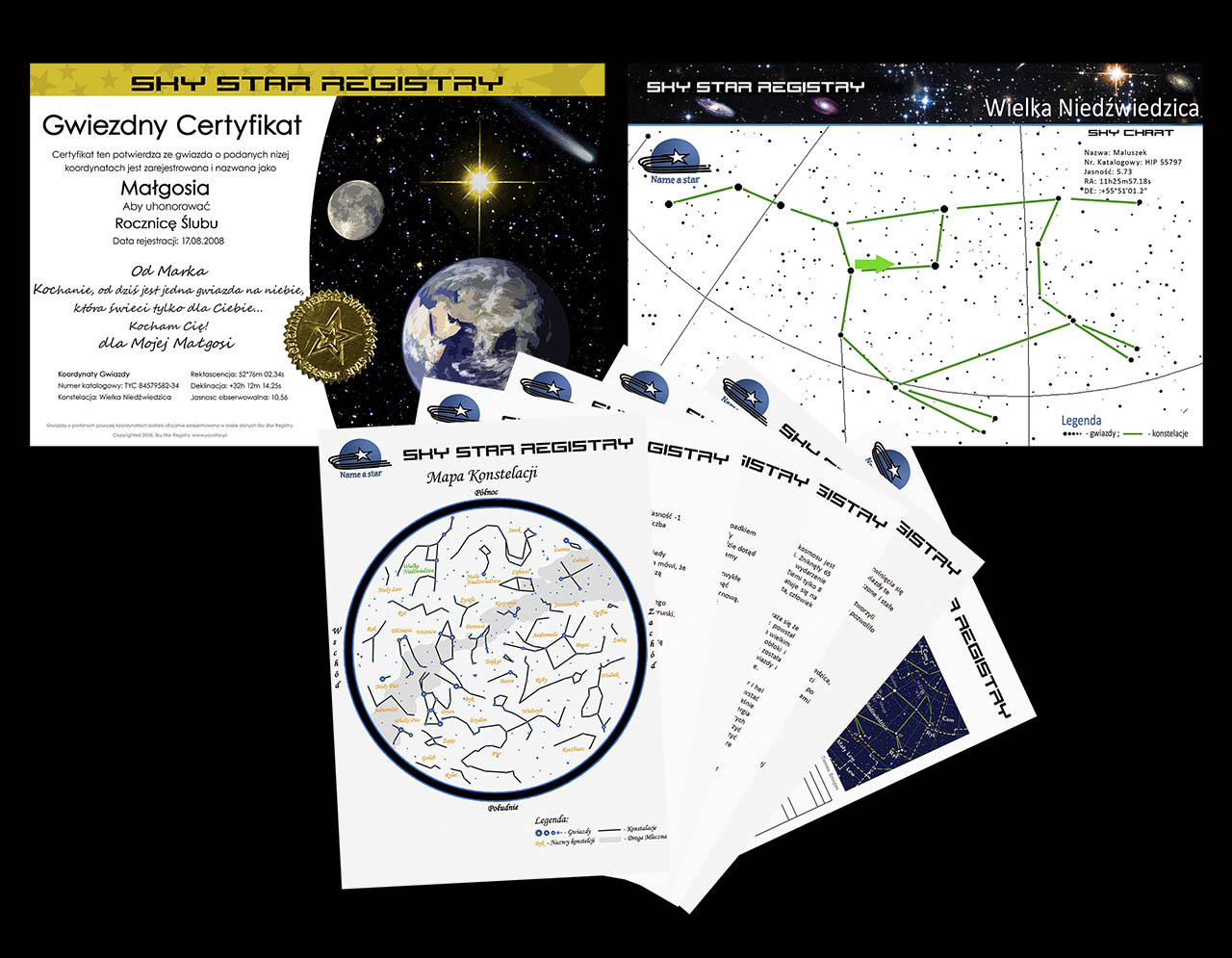 Informacje o wybranej przez Ciebie konstelacji, interesujące fakty na temat gwiazd, jak też wyjaśnienie ich astronomicznych koordynatów, krótka historia Wszechświata i tworzenia się w nim gwiazd oraz list gratulacjyny.